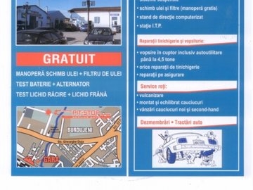 DescriereService auto specializat pe reparatii la CUTII AUTOMATE SAU MANUALE si motoare de orice fel. Deasemenea facem orice fel de reparatii la autoturisme, autoutilitare si camioane: tinichigerie-vopsitorie, reparatii mecanice si electrice, service roti. Suntem autorizati RAR pentru toate marcile de autovehicule...